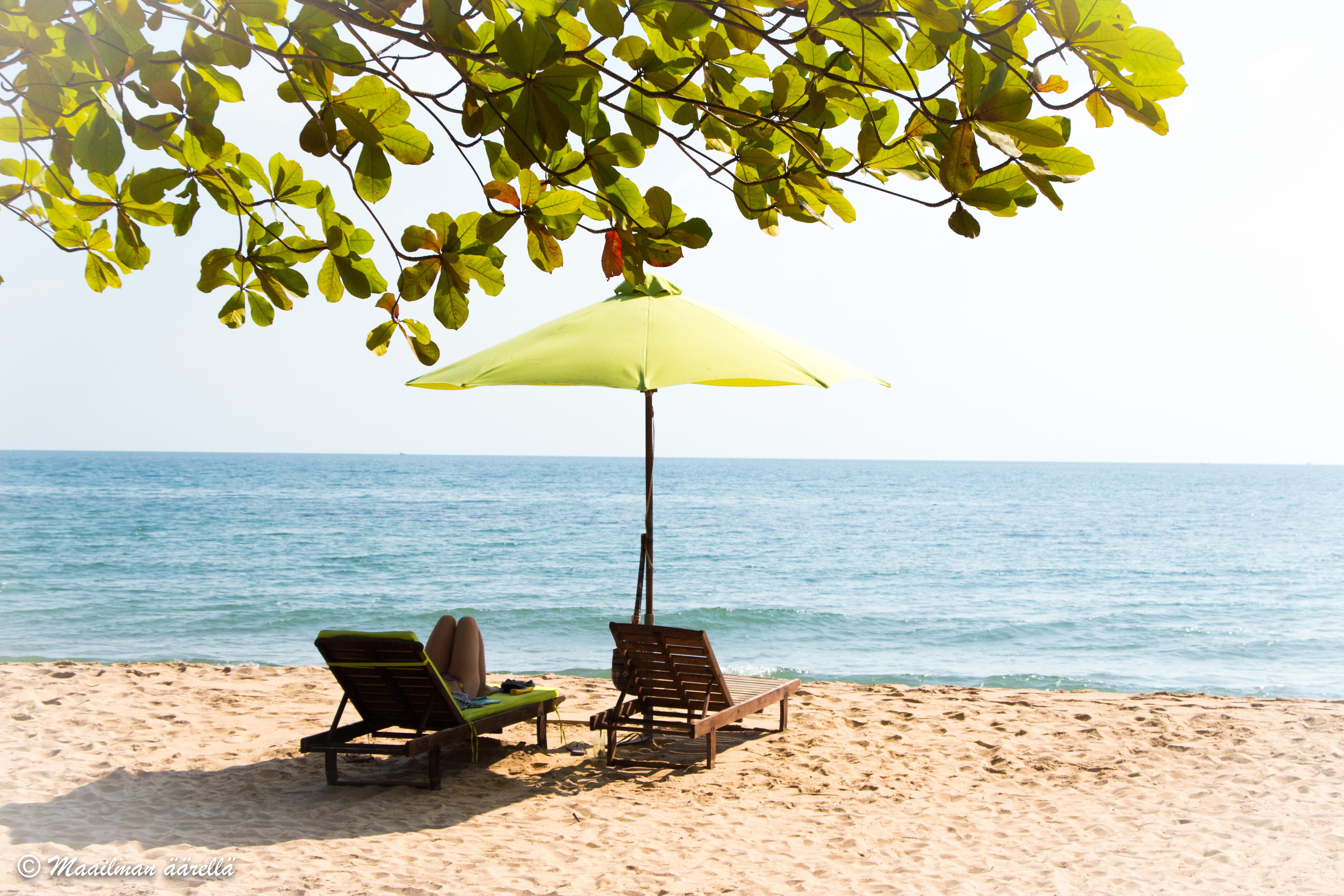 Saan kaikessa rauhassa nauttia palmun alla kookosvettä ja raikkaita kevätrullia. Välillä hyppään kiikkuun ja annan tuulen tuivertaa hiuksissani. Sitten pulahdan mereen. Rantahiekka on kuin onkin valkoista ja silkinpehmeää ja meri kimmeltää turkoosina. Voisin melkein kuvitella löytäneeni oman paratiisini.